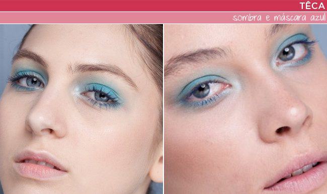 Henrique Martins, responsável pela beleza da marca Têca, arriscou a máscara colorida novamente, combinando com a cor da sombra. Não é que ficou lindo? Todos os produtos usados são da YSL, ele começou esfumando com um lápis azul na cor nº9 (acredito que seja o Dessin du Regard Crayon Yeux), passou uma sombra na cor Colour Harmony Eyes nº5 e finalizou com máscara Everlong nº 3.